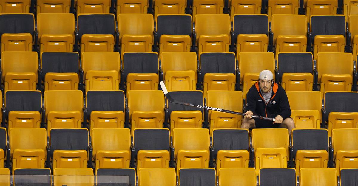 Tiền đạo trung tâm của đội khúc côn cầu trên băng Philadelphia Flyers, Danny Briere ngồi quan sát trên khán đài trước vòng 3 gặp đội Boston Bruins ở vòng loại Giải khúc côn cầu NHL, diễn ra tại Boston (Mỹ), ngày 4-5. (