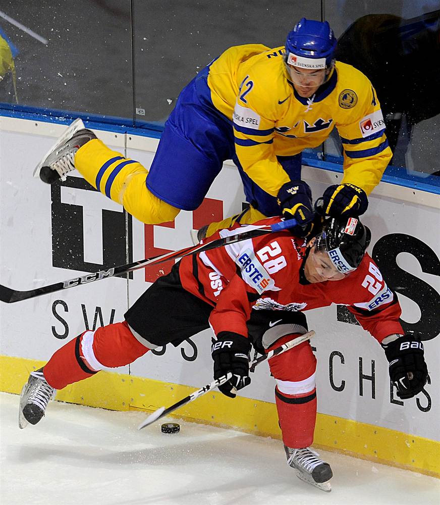 Jimmie Ericsson (Thụy Điển, áo vàng) trong một pha tranh cầu với Martin Schumnig (Áo), ở trong trận đấu thuộc Giải vô địch Hockey trên băng diễn ra tại Kosice (Slovakia), ngày 2-5. (