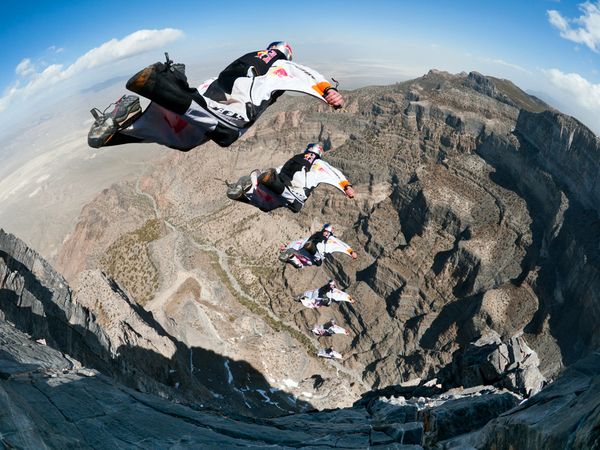 Thử thách về độ cao luôn dành cho các vận động viên tham gia môn nhảy dù vách núi (nhà cao tầng), hay còn gọi là Nhảy BASE (viết tắt của: buildings, antennae, spans (bridges) và earth (cliffs)). Trong ảnh là các thành viên của đội Red Bull Air Force nhảy ra khỏi một vách đá ở dãy núi Utah. Bộ áo của môn thể thao này được thiết kế cho phép vận động viên thực hiện các động tác “bay”, trước khi bung dù hạ cánh an toàn.