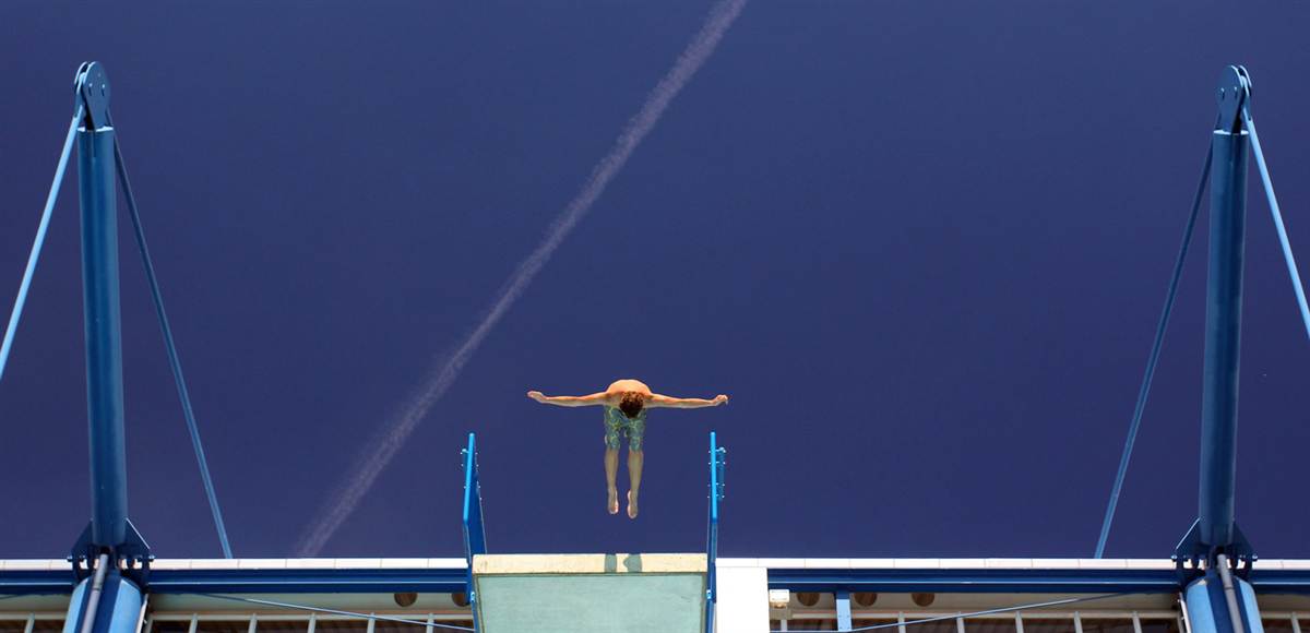Một người dân thể hiện cú nhảy tự do trên một bể bơi công cộng tại Nuremberg (Đức). (