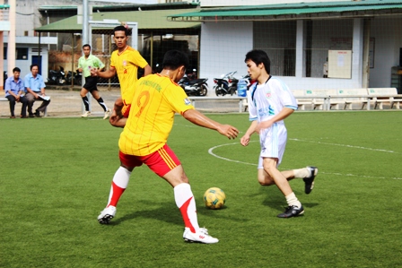 | Sở TNMT Dak Lak (áo vàng) và Sở TNMT Gia Lai (áo trắng) thi đấu ở nội dung bóng đá nam 5 người. |