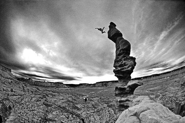 (trên) và Steph Davis, cùng nhau lao mình ra khỏi mỏm đá Ancient Art, Fisher Towers, Utah (Mỹ). Môn thể thao này khá mạo hiểm đòi hỏi người chơi phải mở dù đúng thời điểm, nếu không rất dễ va vào dù của nhau. (
