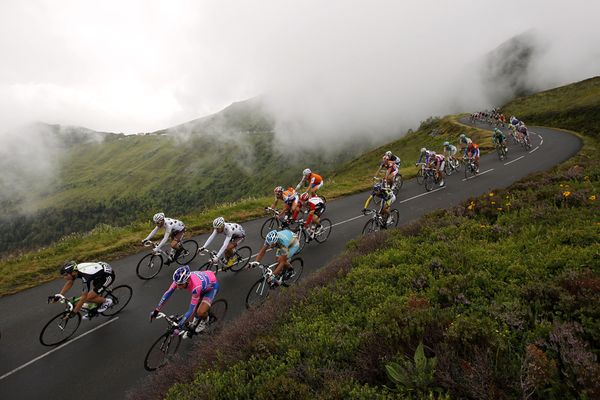 Các vận động viên xe đạp đang vượt qua những khúc cua nguy hiểm ở chặng 9 Giải Tour de France 2011, khi đi ngang qua thị trấn Massiac, Cantal, Auvergne ở miền trung nước Pháp. Tour de France 2011 có tổng cộng 21 chặng với 2132 dặm. (