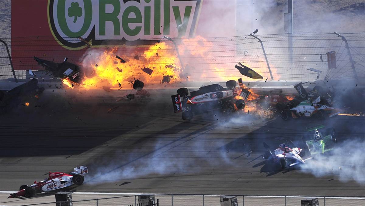 Chiếc xe của Dan Wheldon (trên cùng bên trái) nổ tung sau khi va quệt trong cuộc đua Vegas Las Indy 300. Vụ tai nạn đã khiến Wheldon thiệt mạng. (