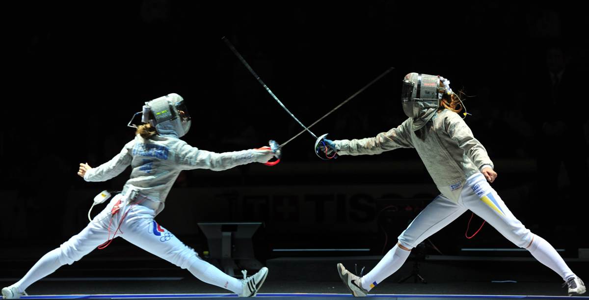 Kiếm thủ Ekaterina Diatchenko (Nga, trái) quyết chiến với Olena Khomrova (Ukraine), trong nội dung kiếm lưỡi cong đồng đội nữ tại Giải Vô địch Đấu kiếm Thế giới diễn ra ở Catania (Italia). Đội Nga giành chức vô địch. (