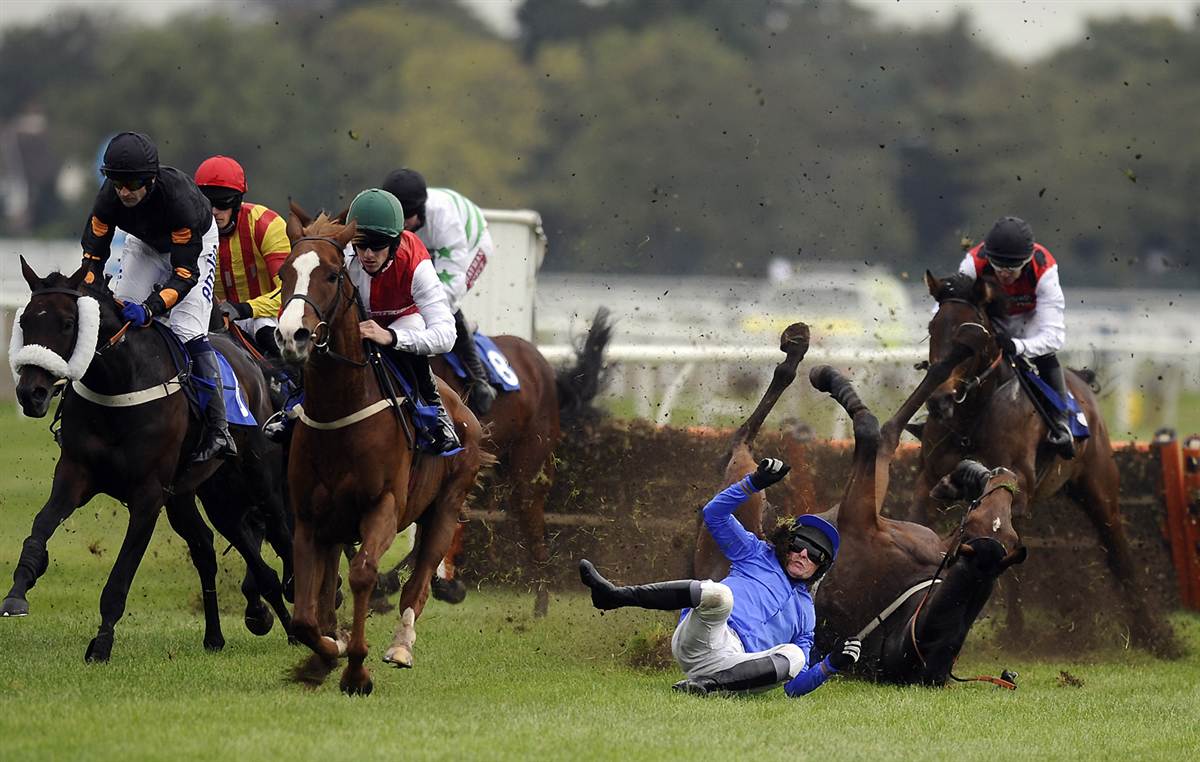 Vụ té ngựa của tay nài Colin Bolger, điều khiển chú ngựa Oceans Destination tại rào cản thứ 2 trong cuộc đua Sunbury (Anh). (