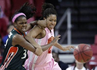 Bullock Sylvia (trái), đội bóng rổ nữ Miami tranh bóng với Tianna Hawkins, đội Maryland ở Giải bóng rổ Đại học diễn ra tại College Park, Maryland (Mỹ). (Ảnh: AP)