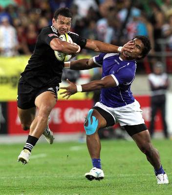 Solomon King (trái), đội bóng bầu dục tìm cách thoát khỏi đối thủ đeo bám Faatonina Autagavaia của tuyển Samoa, ở Giải bóng bầu dục Rugby Sevens diễn ra tại Wellington (New Zealand). (Ảnh: AFP)