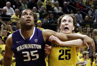 E.J. Singler (phải), tiền đạo đội bóng rổ Oregon, chuẩn bị tranh bóng với Austin Seferian-Jenkins, đội Washington trong trận đấu bóng rổ giữa 2 đội. Kết quả, Oregon giành chiến thắng với tỉ số: 82-57. (Ảnh: AP)