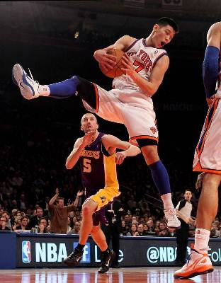 Jeremy Lin (áo trắng), đội New York Knicks tranh bóng thành công trong trận đấu bóng rổ gặp đội Los Angeles Lakers trong trò chơi của họ vào hôm thứ sáu ở New York. Lin đã ghi 38 điểm và giúp đội New York Knicks giành chiến thắng với tỉ số: 92-85. (Ảnh: Zuma Press)
