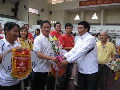 Ban tổ chức tặng hoa và cờ lưu niệm cho các đơn vị tham gia hội thao |