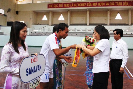 | Phó Chủ tịch UBND tỉnh Dak Lak (Việt Nam) Mai Hoan Niê Kdăm tặng cờ lưu niệm các đội bóng tham gia Giải. |