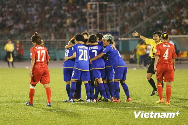 | Pha tranh bóng trong trận đấu giữa Dak Lak (đỏ) và TĐCS Đồng Tháp trên sân nhà Buôn Ma Thuột. |