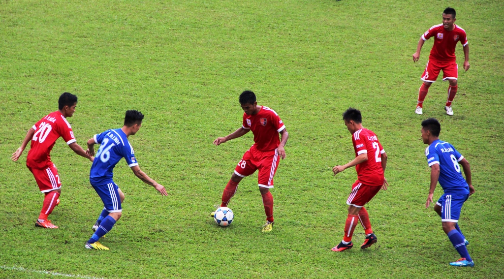 Một tình huống lên bóng của các cầu thủ Dak Lak (áo đỏ). |