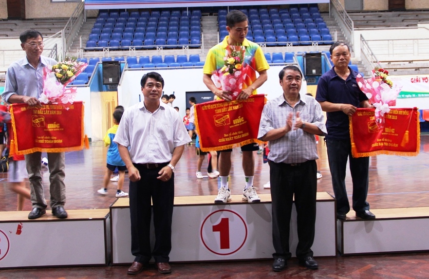 | Ban tổ chức trao Huy chương Vàng môn Kéo co cho đội Viễn thông Đắk Lắk. |