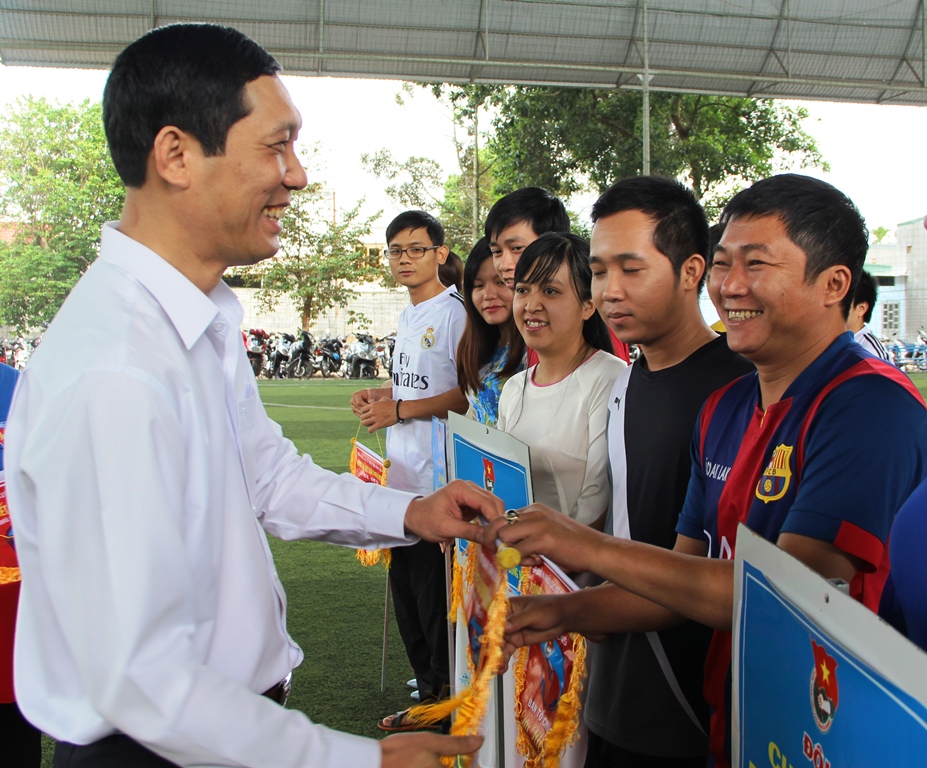 Hai đội Đắk Lắk (áo đỏ) và TP. Hồ Chí Minh làm lễ chào cờ trước giờ thi đấu. |