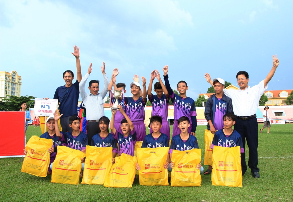 Niềm vui chiến thắng của các cầu thủ Trường THCS Ea Tu (chủ nhà Đắk Lắk). |
