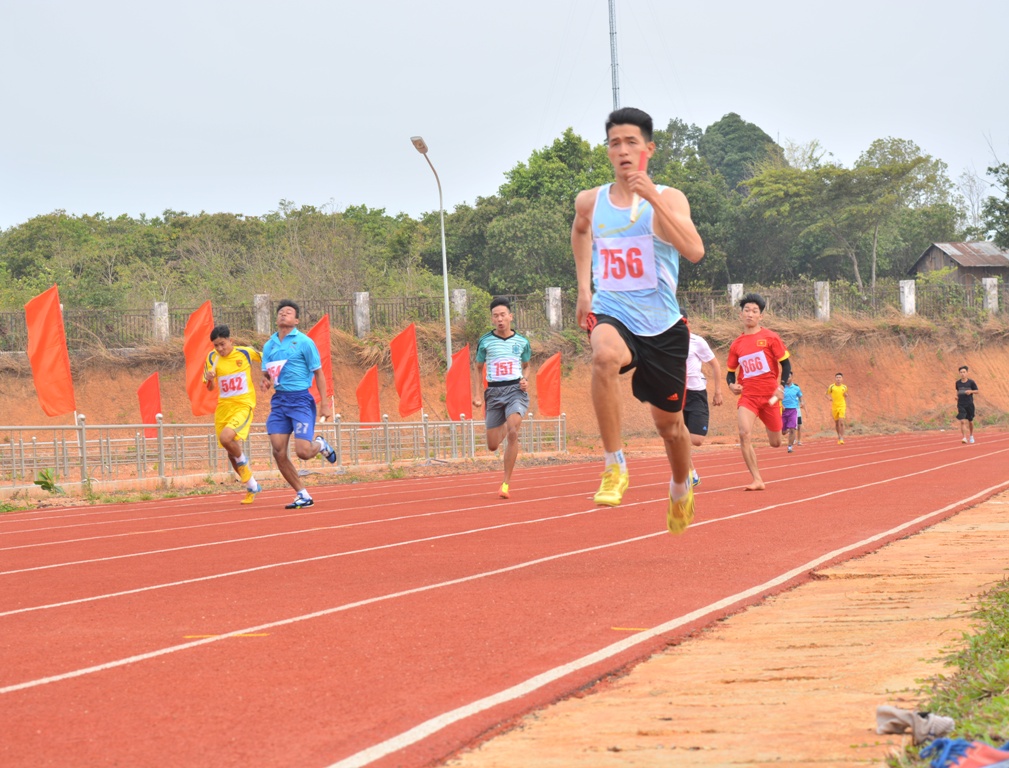 | Vận động viên đoàn Krông Pắc bứt phá về đích nội dung 4x100 mét nam. |