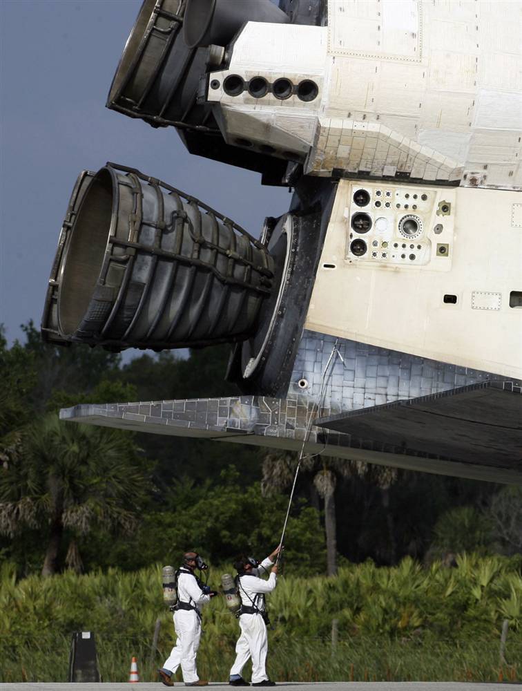 Các kỹ thuật viên đang tìm chỗ rò rỉ trên hệ thống tàu con thoi Atlantis sau khi hạ cánh xuống Trung tâm Vũ trụ Kennedy, bang Florida, Mỹ vào ngày 26-6. Tàu Atlantis đã hoàn thành nhiệm vụ ở trên không gian là kết nối một mô-đun mới do Nga chế tạo với Trạm vũ trụ quốc tế (ISS).