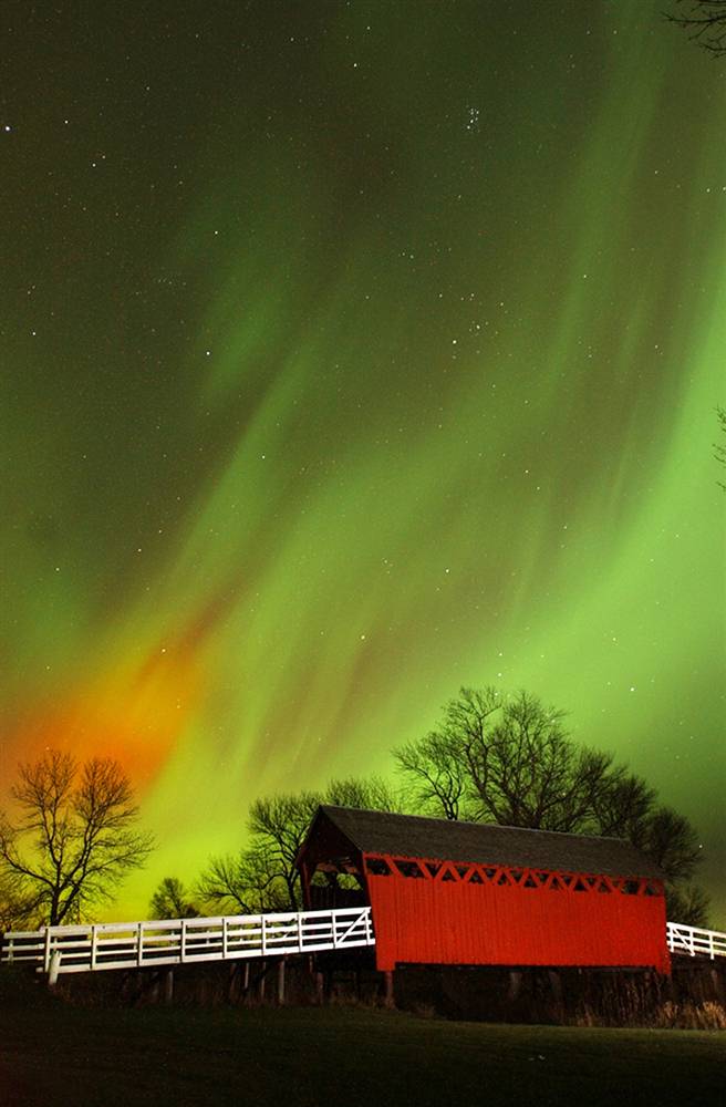 Hiệu ứng ánh sáng của luồng cực quang phía bắc tại Công viên Wilkinson Pioneer, Rock Falls, bang Iowa (Mỹ), trông như một ngọn lửa bùng cháy giữa bầu trời đêm. Bức ảnh được chụp ngày 7-11-2004.