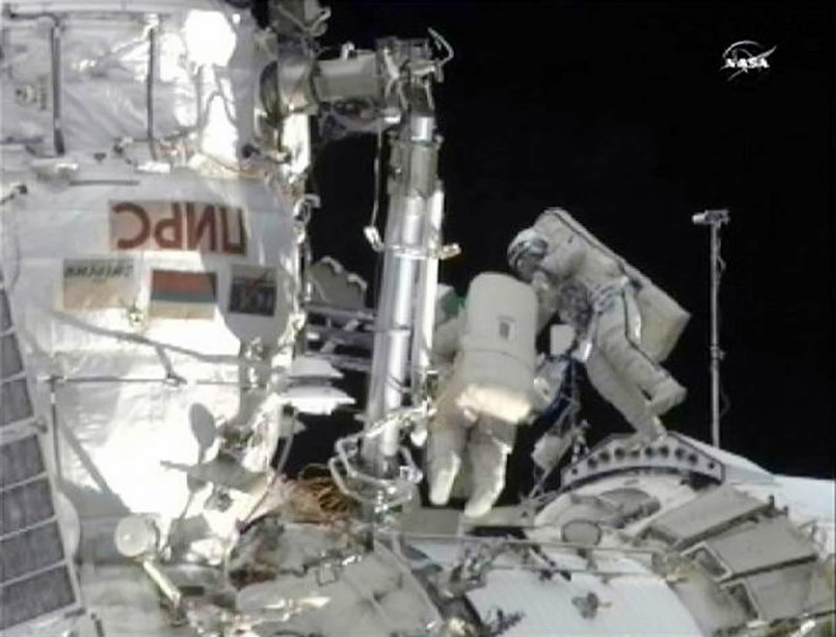 Hai nhà du hành vũ trụ người Nga, Fyodor Yurchikhin và Mikhail Kornienko đang cố định lại một khoang không gian bên ngoài Trạm vũ trụ quốc tế (ISS), hình ảnh này lấy từ kênh truyền hình NASA TV vào ngày 26-7. Các nhà du hành vũ trụ đã trang bị các hệ thống tự động cho các module Rassvet của Nga, lắp đặt các dây cáp và thay thế một máy quay video.