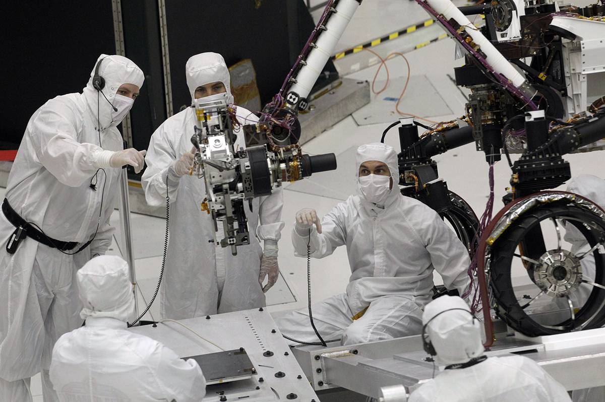 Các kỹ sư đang làm việc trên các rover Curiosity tại Phòng thí nghiệm Jet Propulsion của NASA, ở Pasadena, California(Mỹ), ngày 16-9. Đây được xem là phòng thí nghiệm về sao Hỏa nhằm chuẩn bị cho việc phóng các tàu vũ trụ lên thám hiểm bề mặt của hành tinh đỏ vào năm 2011 của NASA.