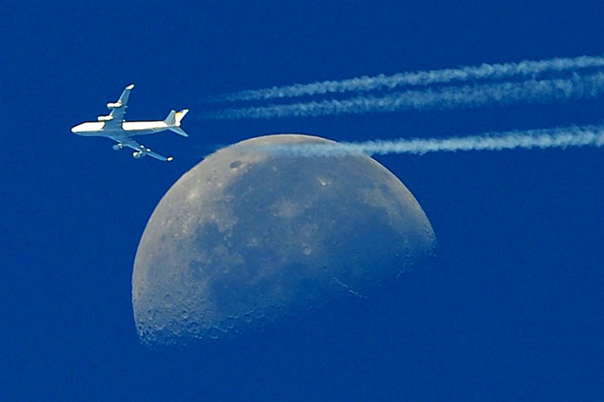 Một máy bay Boeinng 747 bay ngang qua mặt trăng ở Martigues (Pháp), ngày 30-9. (Ảnh: AFP)