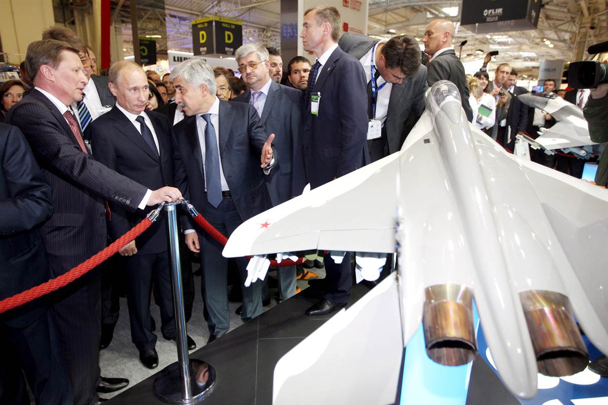 Thủ tướng Nga, Vladimir Putin (thứ hai từ trái sang) thăm gian hàng dành riêng cho Nga tại Paris Air Show vào ngày 21-6. (