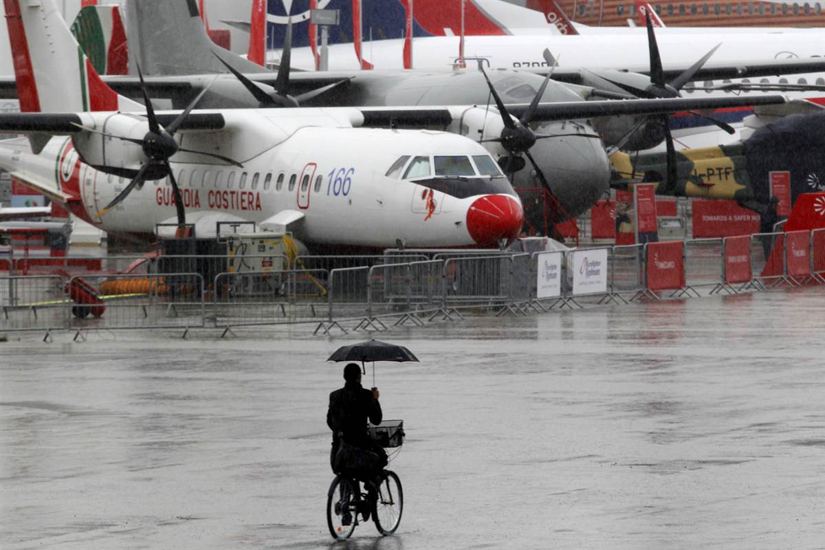 Một vị khách đội mưa tham dự ngày khai mạc Paris Air Show 2011, ngày 20-6. (