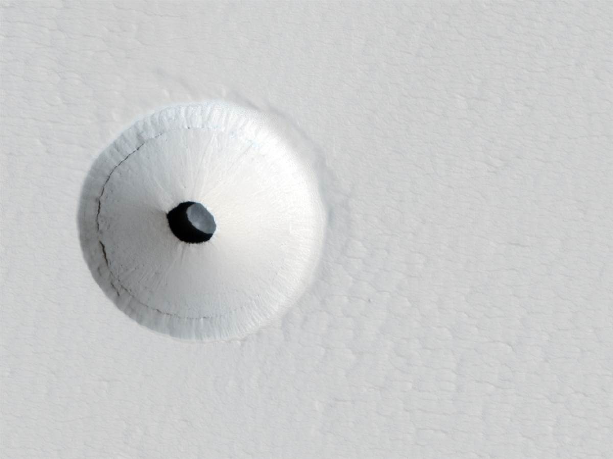 Toàn cảnh miệng núi lửa Pavonis Mons, trên các sườn dốc đầy bụi của Sao Hỏa, được Tàu thăm dò Sao Hỏa Mars Reconnaissance Orbiter của NASA gửi về Trái đất ngày 17-8. Căn cứ vào bóng tối tầng hầm, các nhà khoa học ước tính rằng các hang động của núi lửa này sâu khoảng 65 feet. Hang động này có thể giúp các nhà du hành vũ trụ làm nơi trú ẩn trong hành trình thám hiểm Sao Hỏa ở tương lai. (