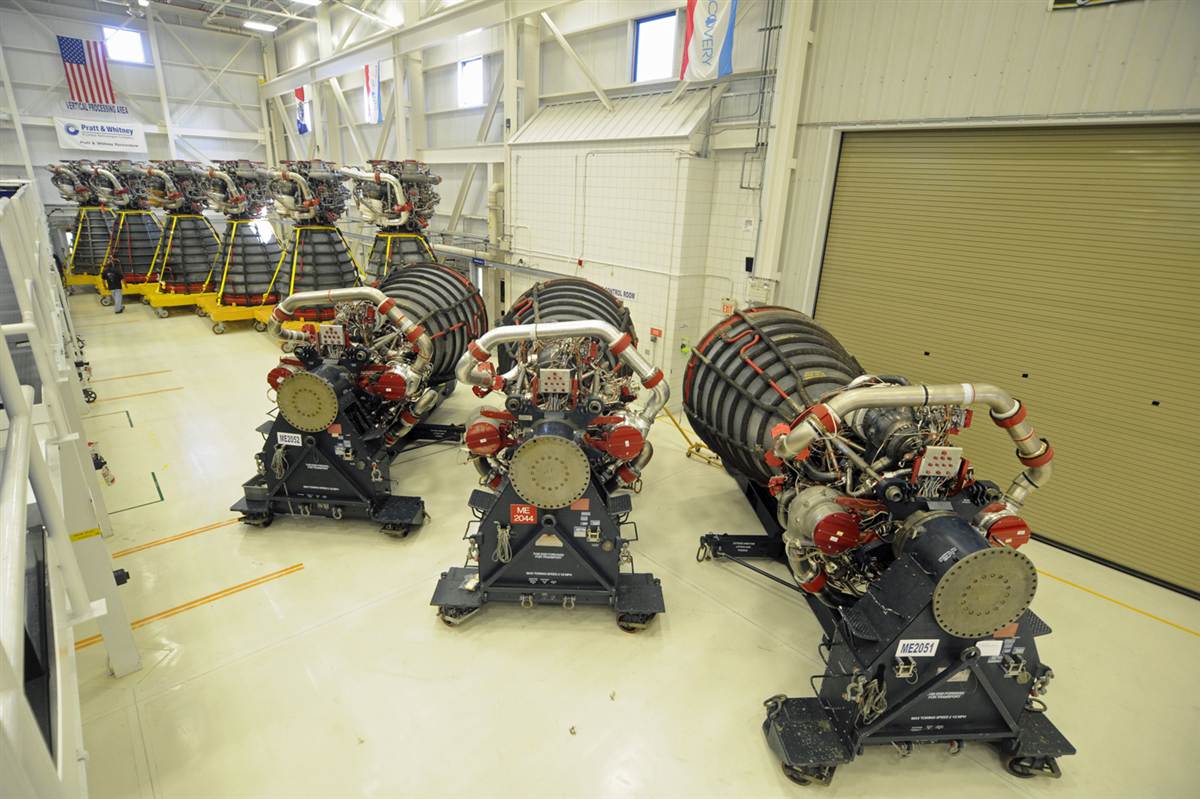 Chín động cơ tàu con thoi được xếp ngay ngắn bên trong Trung tâm vũ trụ Kennedy của NASA ở Florida (Mỹ). Hiện NASA đang có kế hoạch tái sử dụng các động cơ này cho tàu không gian mới của mình. (