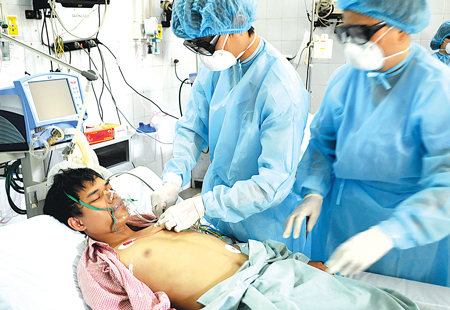 | Bác sĩ khoa Nhi đang theo dõi bệnh nhân tay - chân - miệng tại phòng cấp cứu Nhi. Ảnh: Bảo Châu |