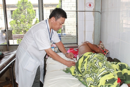 | Nữ hộ sinh khoa Ngoại sản, Bệnh viện Đa khoa huyện Ea Kar lấy máu gót chân của trẻ sơ sinh để sàng lọc. |