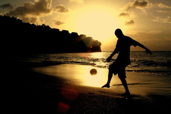 Anh Raymond, một “huyền thoại bóng đá địa phương”, đang luyện tập các kỹ năng của mình vào lúc hoàng hôn trên bãi biển gần Castries, St Lucia, trong vùng biển Caribbean.(