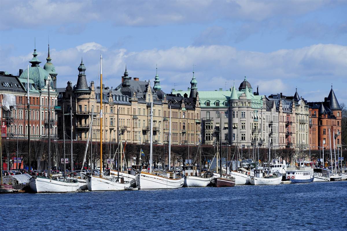 Tàu, thuyền buồm xếp hàng dài trên bờ biển ở Stockholm, thủ đô và thành phố lớn nhất ở Thụy Điển. Thành phố này được xây dựng trên 14 hòn đảo kết nối bởi 57 cây cầu. (