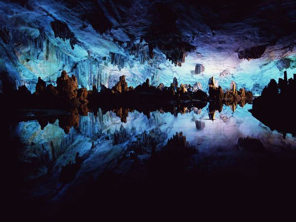 Sự huyền ảo trong hang động Reed Flute (Trung Quốc) khi được thắp sáng bởi các bóng đèn đầy màu sắc. Động Reed Flute được hình thành bởi một dòng sông ngầm cách đây hơn nửa triệu năm, ngay trên vùng núi đá vôi cao đã tạo thành một trong những điểm thu hút khách du lịch nhất trong khu vực. (