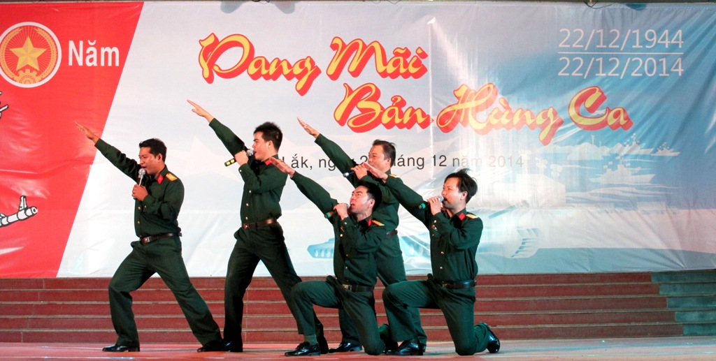 Tối 21-12, Bộ Chỉ huy Quân sự (Bộ CHQS) tỉnh phối hợp Trung tâm Văn hóa tỉnh tổ chức biểu diễn nghệ thuật “Vang mãi bản hùng ca” nhân dịp chào mừng kỷ niệm 70 năm Ngày thành lập Quân đội nhân dân Việt Nam (22-12-1944 – 22-12-2014) và 25 năm Ngày hội Quốc phòng toàn dân (22-12-1989 – 22-12-2014).