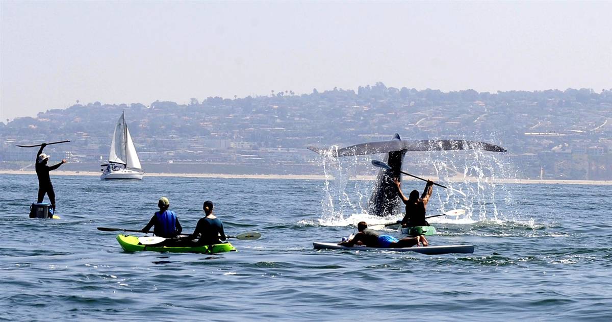 Những người chèo và bơi thuyền đang vui đùa với một chú cá voi ở bờ biển miền Nam California, gần khu ngoại ô Los Angeles(Mỹ).