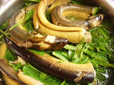 Nguyên liệu: Cần nước (chọn loại màu xanh), bắp cải trắng, rau răm, ớt quả, hành lá, hành tím, nước muối dưa.