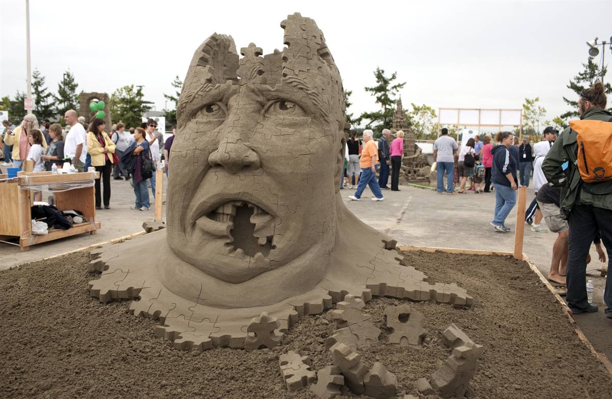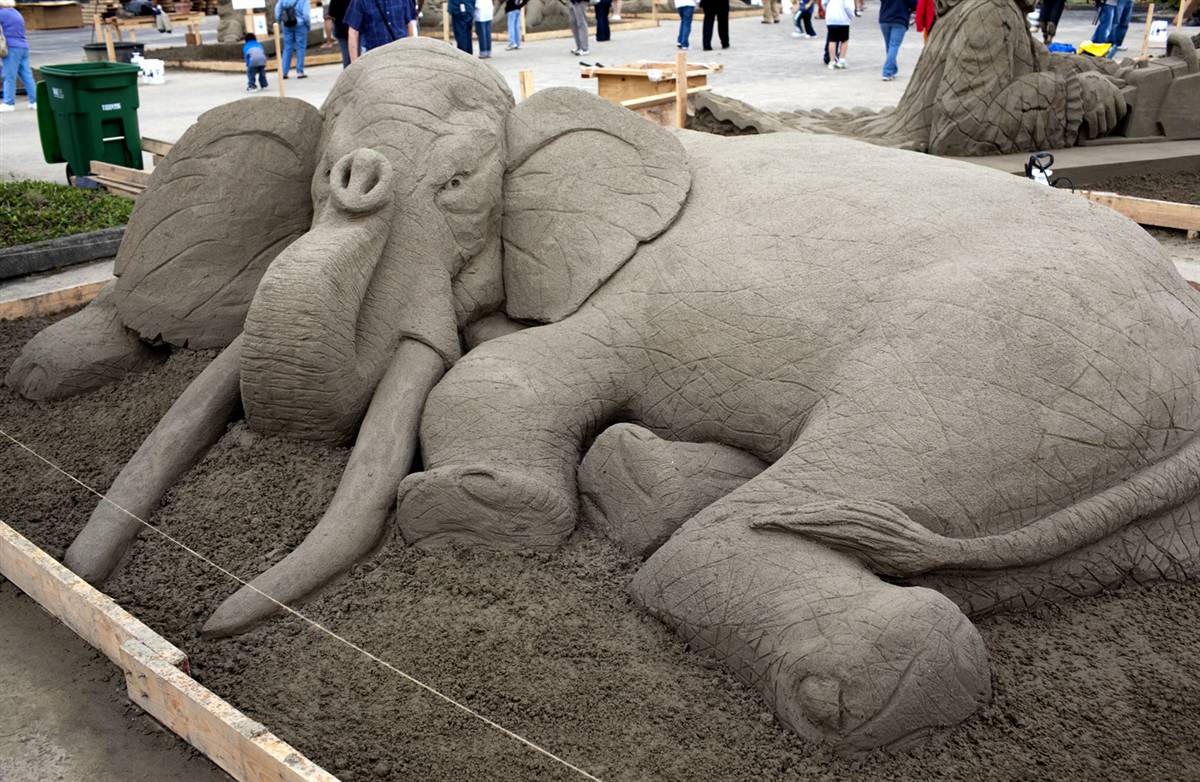 Nghệ sĩ cát Brit Paul Hoggard tạo nên con voi này bằng kỹ thuật gọi là "gói phần mềm," có nghĩa là ông không sử dụng tới hình thức khi bao bì cát.