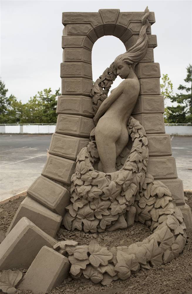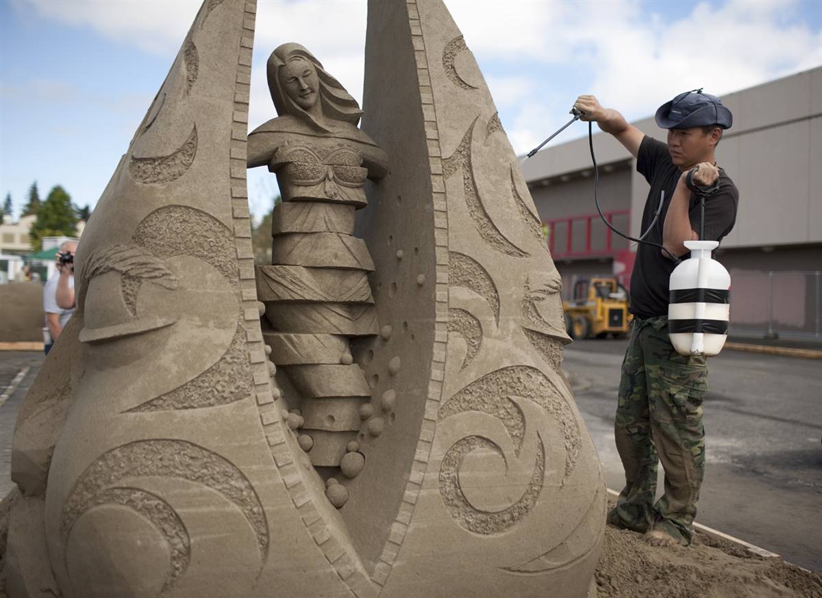 Nghệ sĩ cát Damon Langlois đến từ Victoria, British Columbia (Canada) đang hoàn tất những nét điêu khắc cuối cùng cho tác phẩm "Connected" của đội Sand Boxers.