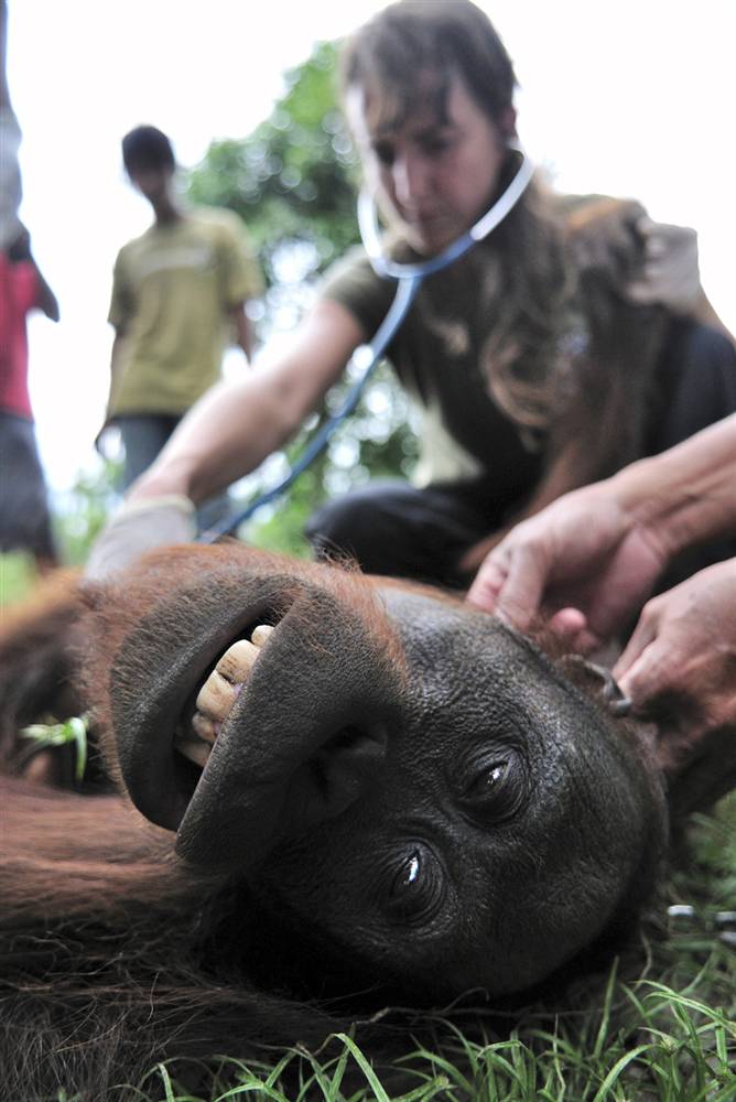 Tiến sĩ Karmele Llano Sanchez từ tổ chức Cứu hộ động vật quốc tế đang kiểm tra sức khỏe của một con đười ươi ở Tây Kalimantan (Indonesia). (