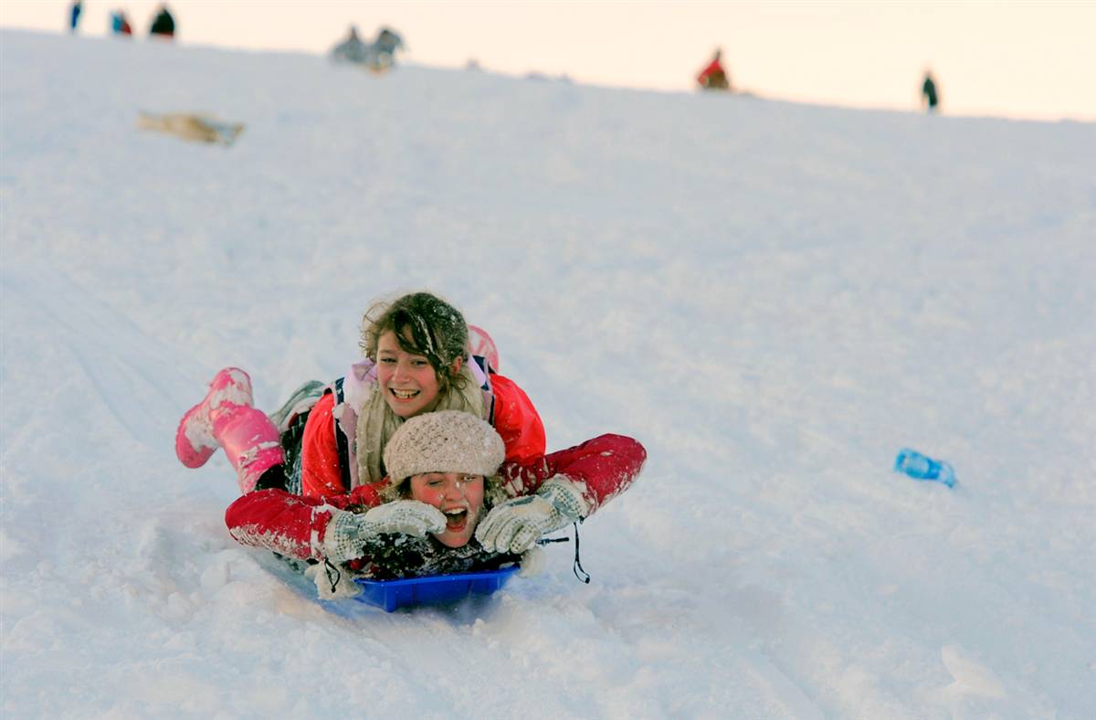 Rachel Douglass (trên) và Sophie Coatsworth vui đùa trong trò chơi trượt máng tuyết ở Moor Town, Newcastle (Anh), ngày 29-11. (