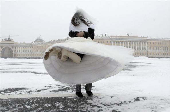 Cô dâu chú rể ăn mừng đám cưới trong tuyết ở Dvortsovaya Square, St Petersburg (Nga), ngày 25-11. (