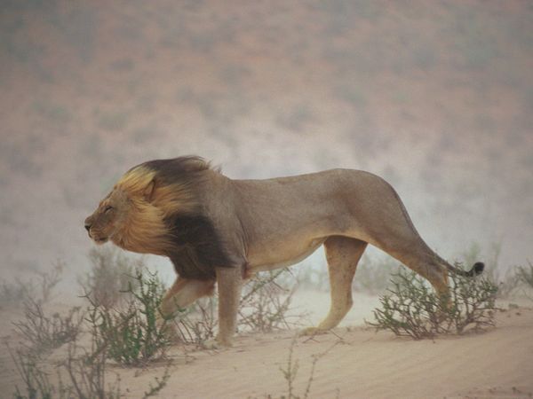 Con sư tử đang đi "tuần tra" trong lãnh địa của nó ở Vườn Quốc gia Kalahari Gemsbok (Nam Phi).