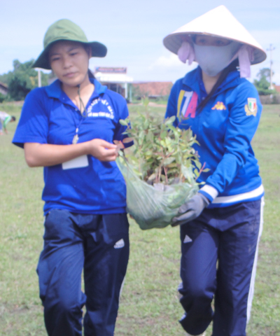 | Thực hiện công trình thanh niên của mình, các chiến sĩ TNTN đã trồng được hơn 1.000 cây xanh trên các trục đường giao thông trong xã |