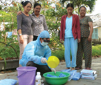 | Cán bộ y tế đang hướng dẫn người dân tẩm màn bằng hóa chất diệt muỗi để phòng chống sốt rét. Ảnh: TL |