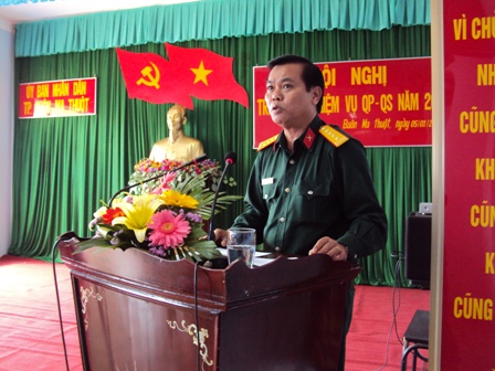 | Đại tá Êban Y Phu, Ủy viên Ban Thường vụ Tỉnh ủy, Chỉ huy trưởng Bộ Chỉ huy Quân sự tỉnh phát biểu chỉ đạo tại Hội nghị |