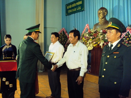 | Phó Bí thư, Chủ tịch UBND tỉnh Hoàng Trọng Hải tặng hoa chúc mừng cán bộ, chiến sĩ biên phòng Dak Lak nhân kỷ niệm Ngày truyền thống. |