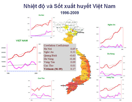 | Sự tương quan giữa nhiệt độ và số mắc SD/SXHD (không bao gồm những năm có dịch bùng phát đặc biệt) theo báo cáo tại Việt